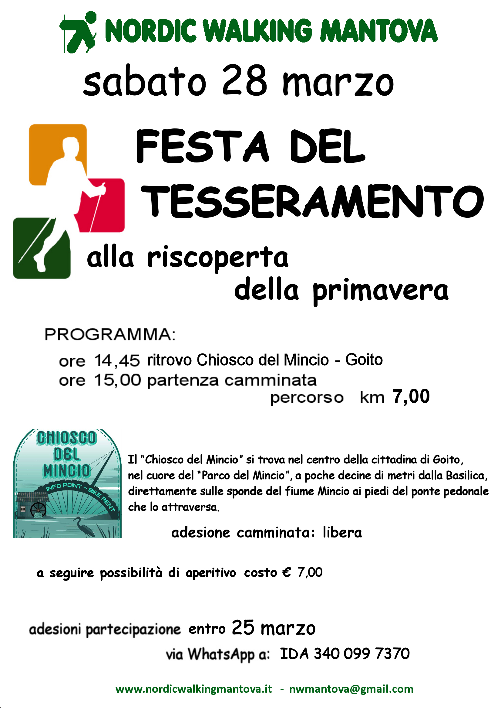Cari Amici e Soci in un anno difficile, come quello appena trascorso, abbiamo bisogno del tuo supporto, per far sì che la nostra associazione continui a essere occasione di incontro e confronto fra persone diverse, per stare insieme e per poter presto tornare a fruire delle bellezze del nostro territorio. Con l'adesione alla nostra associazione potrai diventare partecipe di tutti quegli eventi che verranno organizzati nell'anno corrente. Essere soci NORDIC WALKING MANTOVA vuol dire soprattutto credere in quello che in questi anni abbiamo fatto per il benessere delle persone ed aiutarci a continuare a farlo. Il costo annuale della tessera 2026 è di 25,00 €. Rivolgiti al tuo istruttore per le modalità di versamento. Il Presidente Comini Luciano